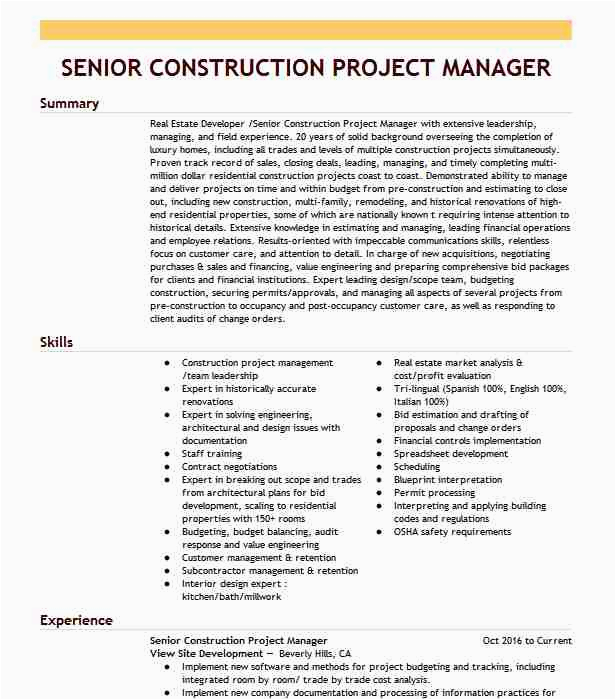 There will be many career books and guides that you can search out at the library or bookstore, which will have at least one Senior Construction Project Manager Resume Samples for you to study, oftentimes more.
