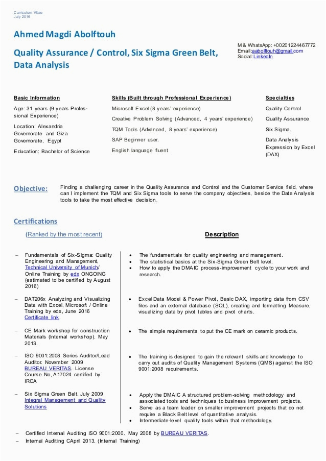 Bearing in mind you are searching for the perfect job, you will of course desire to put your best foot refer later an fabulous and well-formatted resume. One habit of assuring that you have such a resume is to download a six sigma green belt resume sample. These templates can meet the expense of you considering the exact resume you are looking for or comprehensibly use them as a guide to create your own.