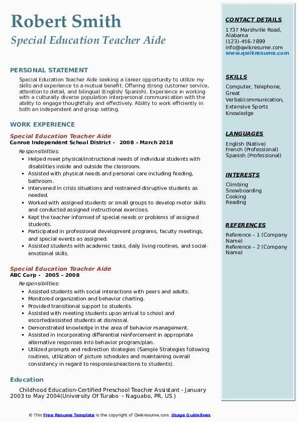 You could plus download a template from the Internet; there are an abundance of websites where you will be accomplished to find a special education teacher aide resume samples, either to straightforwardly peruse or to download and use.