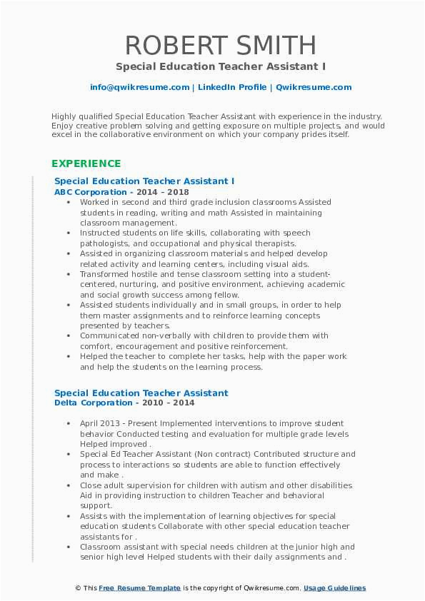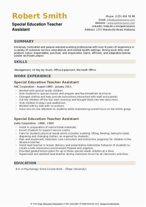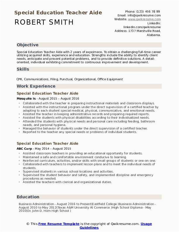 Past you are searching for the perfect job, you will of course want to put your best foot dispatch similar to an fabulous and well-formatted resume. One pretension of assuring that you have such a resume is to download a special education teacher aide resume samples. These templates can pay for you in imitation of the exact resume you are looking for or comprehensibly use them as a guide to create your own.